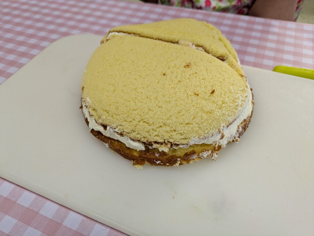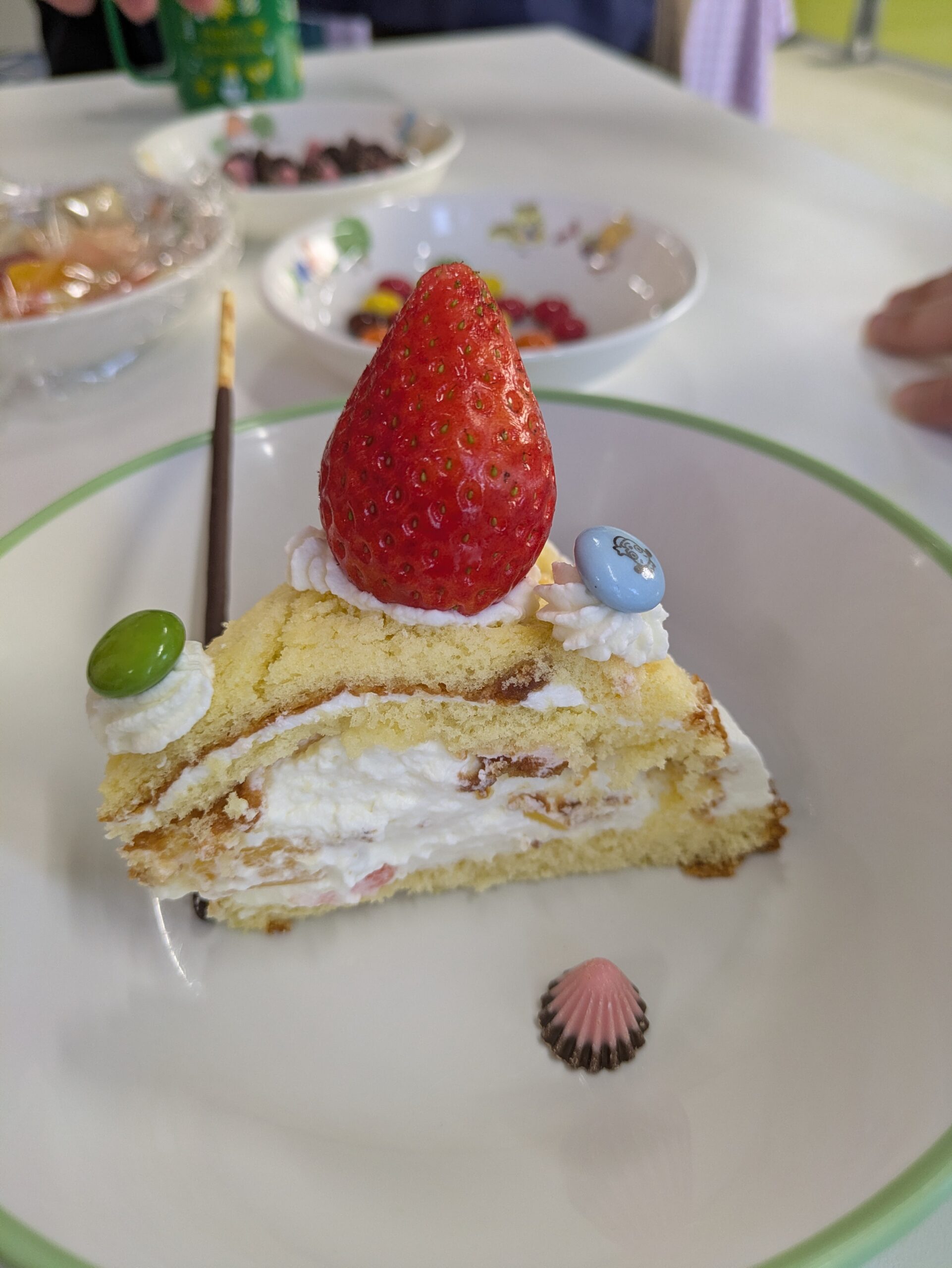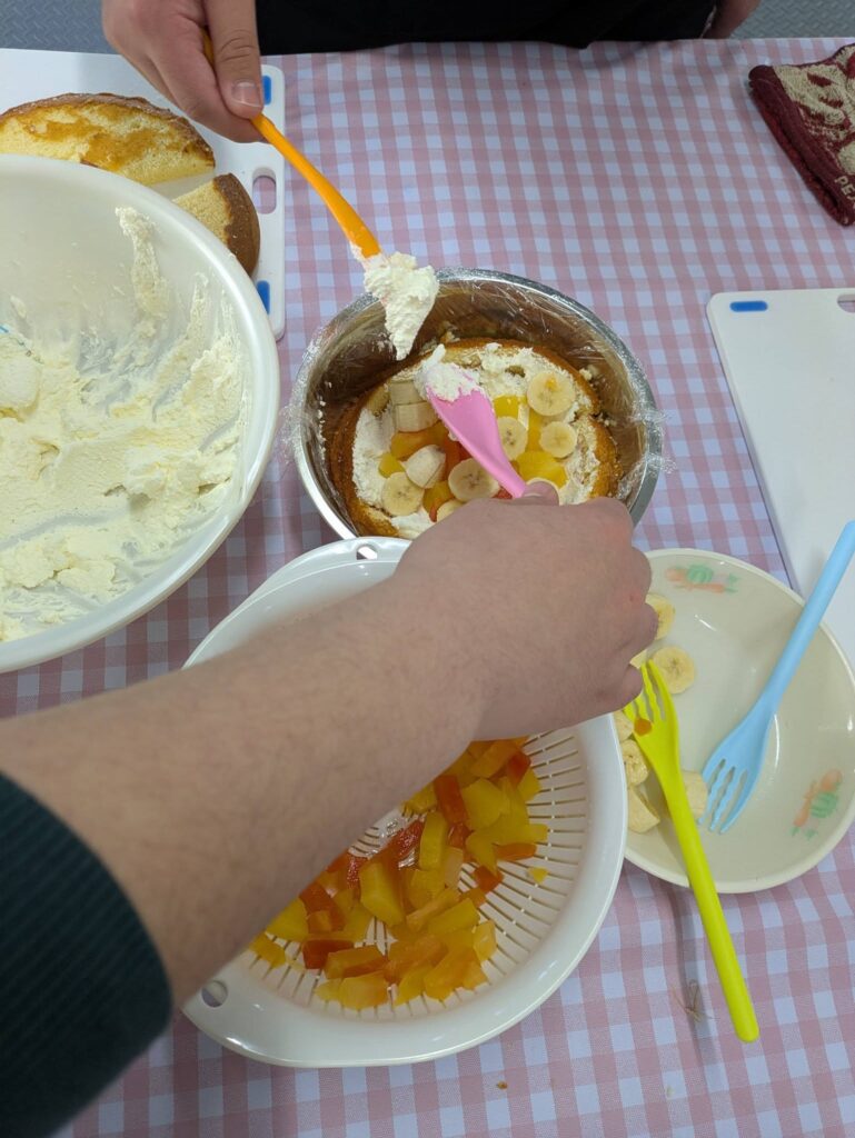 スポンジケーキを焼くことは出来なかったけど、ケーキの土台を作り、生クリームを泡立てて、フルーツをカット。あとは、自分好みに飾りつけをして完成です。