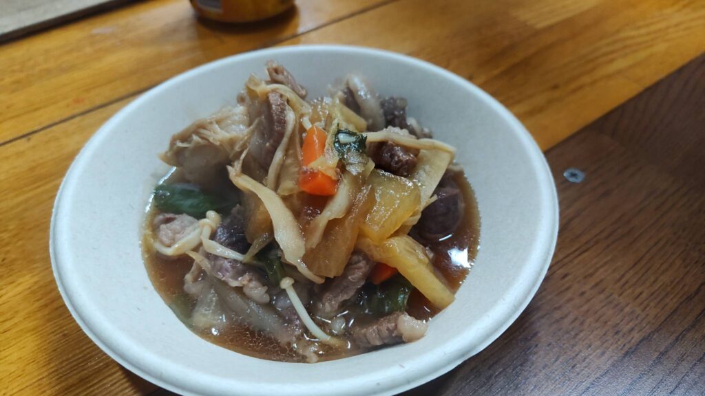 実際に食べてみると、肉の濃厚なうまさと固いところ柔らかいところが混じった食感がとても美味しい。しっかりした味付けがとても合っていました。