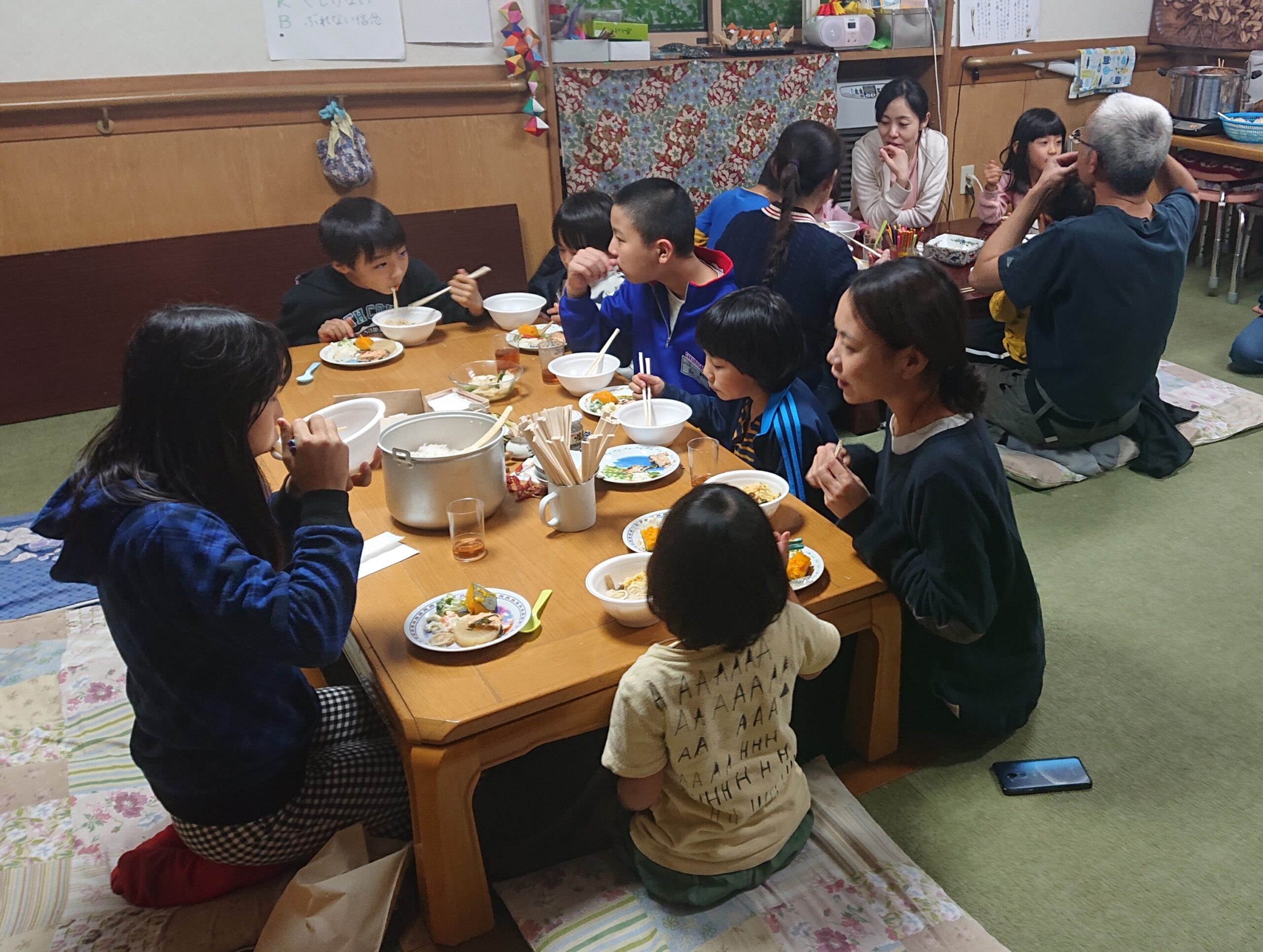 近くにある保育園の帰りにあわせて平日の夕食を月に3回。日や曜日を固定しないのは、「来られない人を固定しない」ためのこだわり。たまには食事の用意や片付けを気にせず、のんびりこどもと触れ合う時間をつくってほしいと呼びかけた。誘い合わせてやってくる親子は食後、こどもたちが遊ぶ傍らで親たちの会話が遅くまで弾んでいた。卒園後、何年経ってもたまに顔を出してくれる家庭もある。